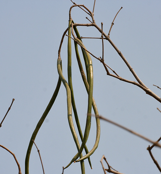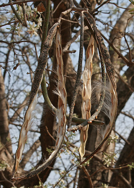 ಕಾಯಿಗಳು ಸಾಮಾನ್ಯವಾಗಿ ಆಗಸ್ಟ್‌ನಲ್ಲಿ ಹಣ್ಣಾಗುತ್ತವೆ. ಹಣ್ಣು ಉರುಳೆಯಾಕಾರವಿದ್ದು, ಕಪ್ಪು-ಹಸಿರು ಬಿಳಿ ಚುಕ್ಕೆಗಳಿಂದ ಕೂಡಿದ್ದು, ಉದ್ದನೆಯ ಕೊಂಬಿನಂಥದ್ದು ಮತ್ತು ತುದಿಯಲ್ಲಿ ಕೂಡಿಕೊಂಡಿರುತ್ತವೆ. ಬೀಜಗಳು ಕಂದು ಮತ್ತು ಚಪ್ಪಟೆಯಾಗಿರುತ್ತವೆ. ಬೀಜ ಪ್ರಸರಣವು ಗಾಳಿಯಿಂದ ಮತ್ತು ಪರಾಗಸ್ಪರ್ಶವು ಕೀಟಗಳಿಂದ ಆಗುವುದು.